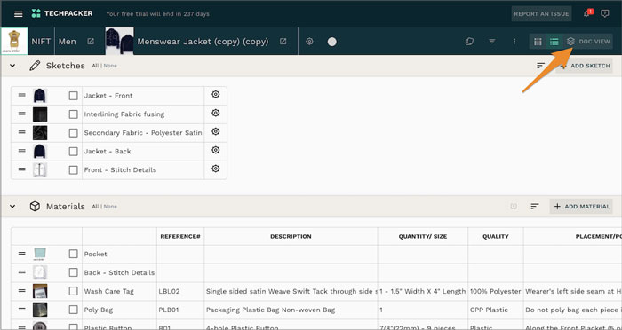 Step a: Click on the Doc View/Tech Pack on your techpack board/product workspace